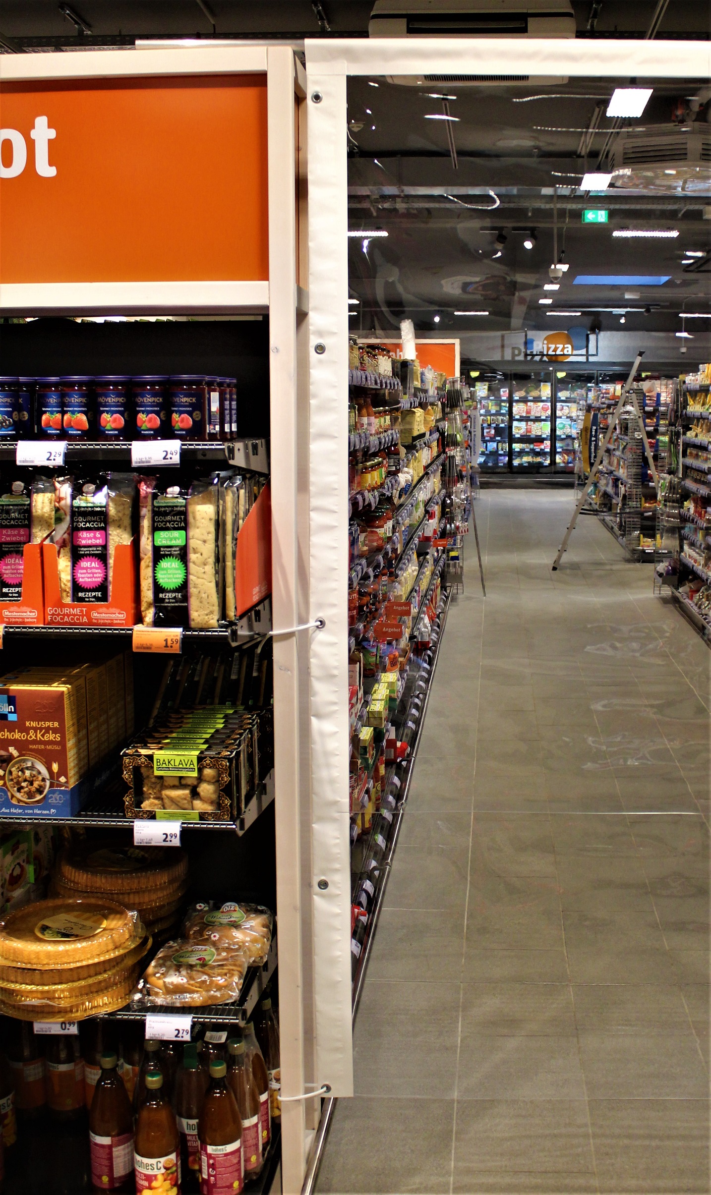 Unsere Gangabtrennung/Laufwegabtrennung aus transparenter PVC-Plane bietet die optimale Lösung, um einen kontrollierten Ablauf des Einkaufens anderer Kunden zu gewährleisten.